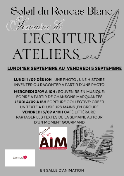 Un résidence d'écriture début septembre au Soleil du Roucas blanc a donné naissance a des textes écrits ou dictés par nos résidents , accompagné par l'Art thérapeute Marianne Ecoffet et les photographies de Bernard Magneville .